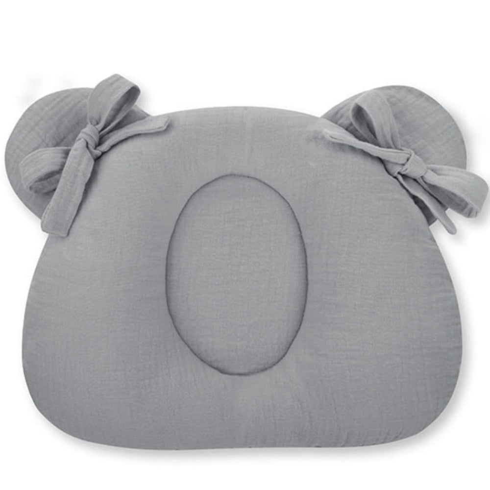 Das Babykissen ist aus weichem Baumwollmusselin gefertigt und hat die Form eines Teddybärkopfes.