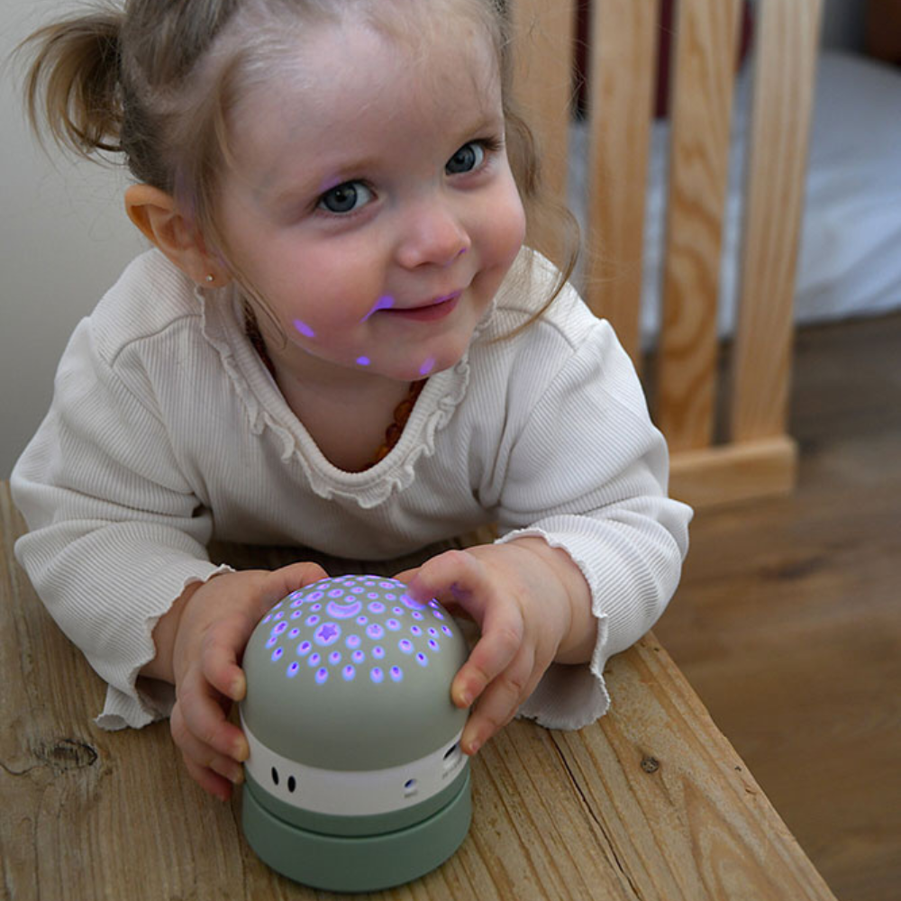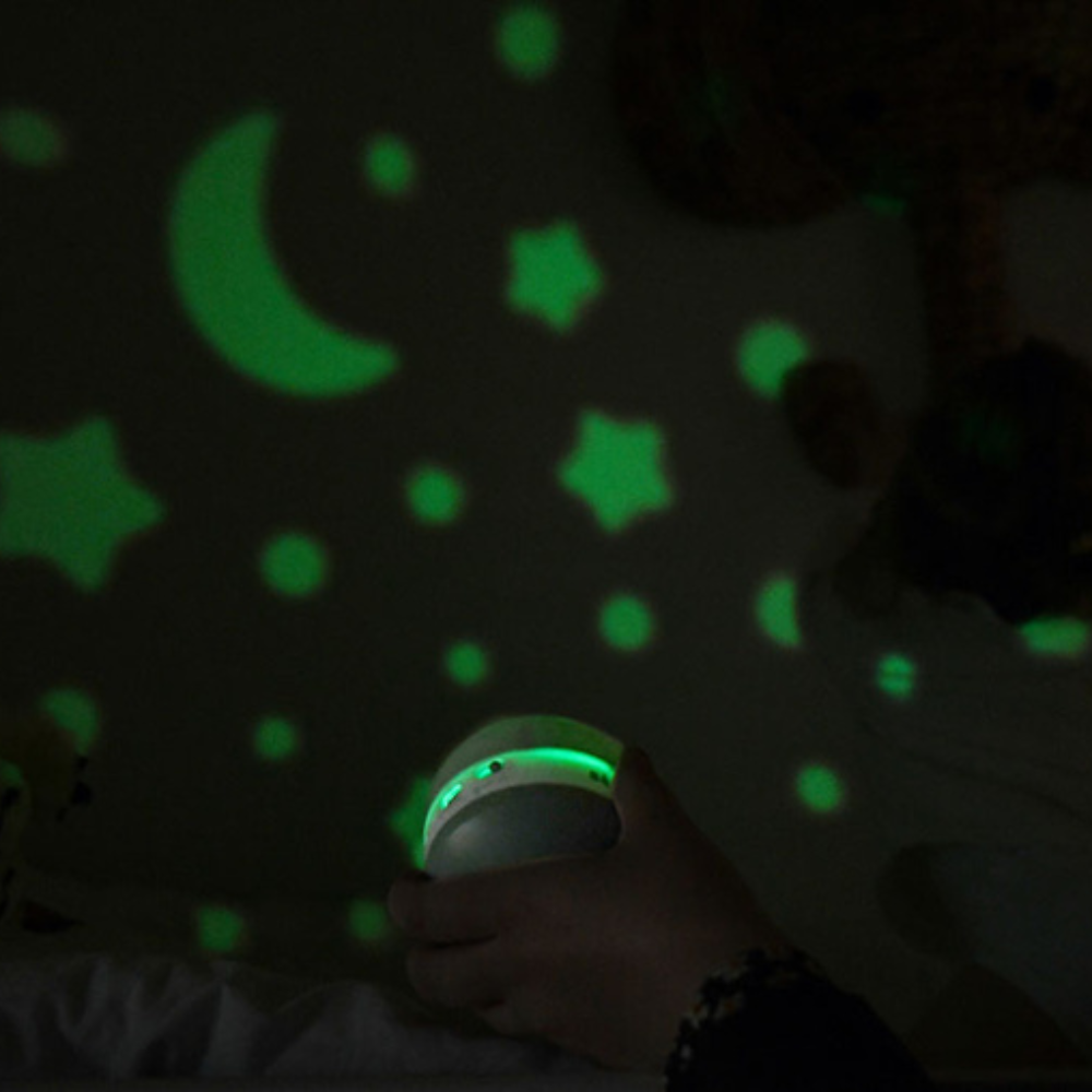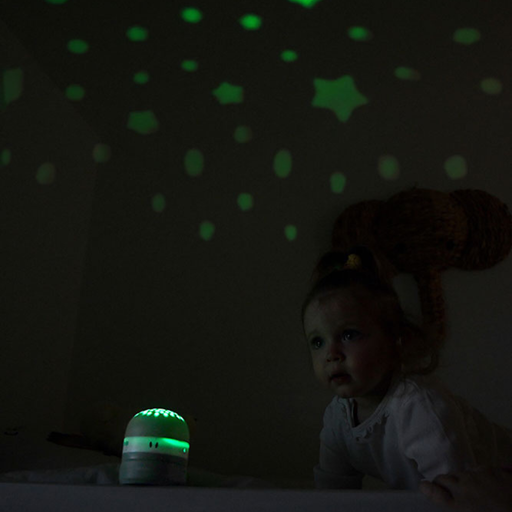 Dieser kompakte Projektor hilft Ihrem Kind, sich vor dem Schlafengehen zu beruhigen, indem er es in einen sanften Sternenhimmel und beruhigende Klänge einhüllt.