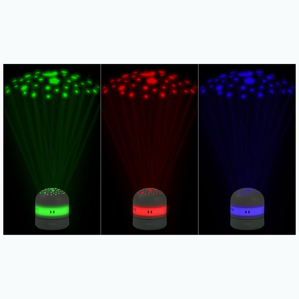 Das Beaba-Gerät projiziert Sterne in drei Farben - rot, grün, blau - mit einer Auswahl von gleichmäßigem, wechselndem oder zufälligem Licht. Mit dem verstellbaren Projektionswinkel können Sie das Bild an die Decke, die Wand oder an einen Ort Ihrer Wahl richten - genau dorthin, wo Ihr Baby vor dem Schlafengehen gerne hinschaut.