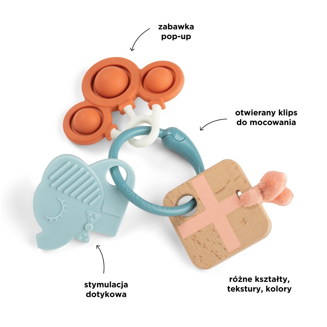 Das leicht zu greifende Set, das mit einem Clip verbunden ist, macht das Sensory Toy auch ideal für die Reise, wenn es am Kinderwagen, Autositz oder in der Tasche befestigt wird.