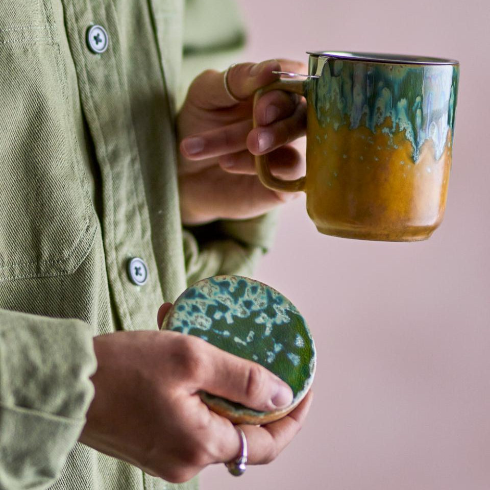 Aufgrund der Glasur variiert jede Teetasse in warmen Erdtönen und hellen Perlglanznuancen.