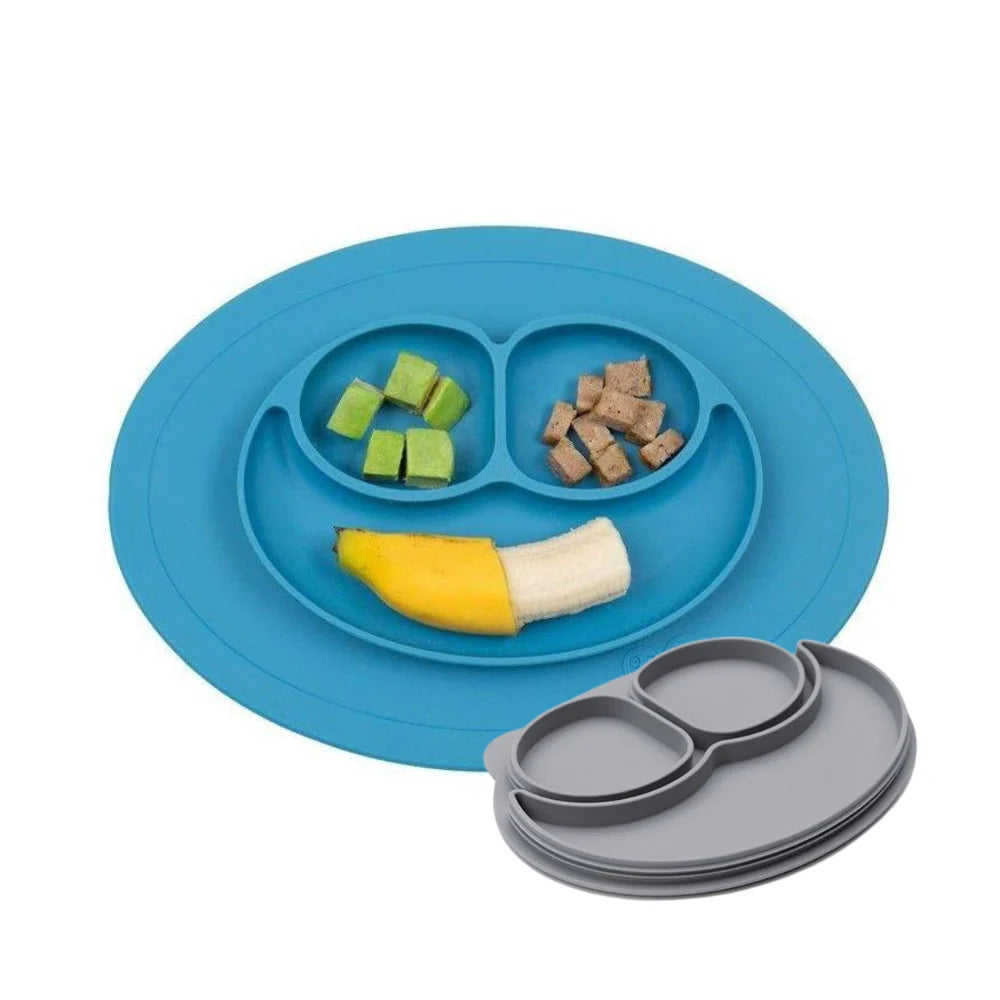 EZPZ Silikonteller blau mit Pad klein 2in1 Mini Mat ist ein praktisches Pad und Teller in einem. Sie ist aus sicherem Silikon hergestellt. Sie wird in einer wiederverschließbaren Verpackung geliefert, damit Sie sie auch unterwegs mitnehmen können. Diese moderne Silikonmatte haftet perfekt auf einem Tisch oder einer anderen glatten Oberfläche. So wird verhindert, dass Ihr Kind sie vom Tisch herunterrutschen kann. Sie hat eine ovale Form und ein ästhetisch ansprechendes Design. Der Teller ist in 3 Fächer unterteilt, so dass Sie Ihre Mahlzeit in Portionen aufteilen können.