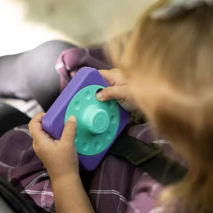 Das kompakte Spielzeug lässt sich leicht im Kinderwagen, Autositz oder Rucksack mitnehmen - der perfekte Reisebegleiter von Fat Brain Toys.