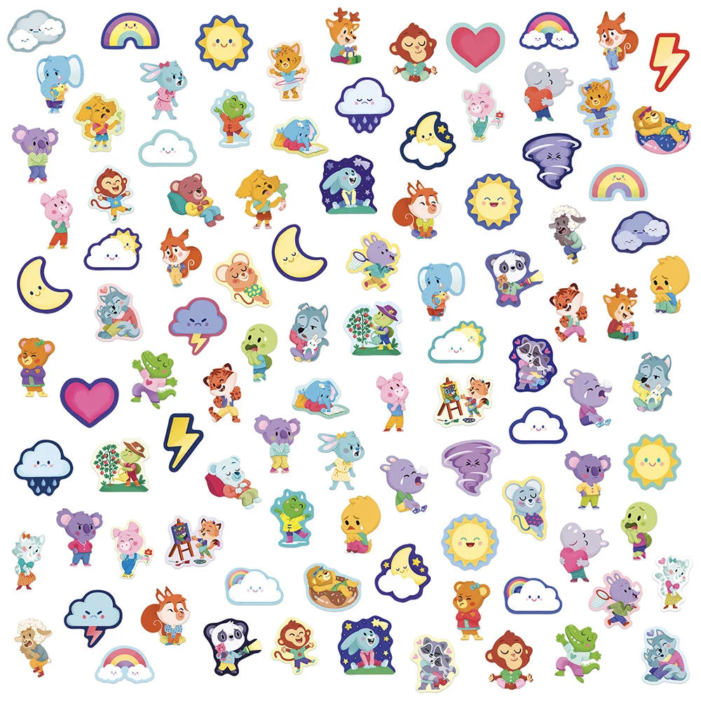 Im Inneren warten Tiere und Elemente der Natur darauf, verschiedene Emotionen wie Freude, Wut, Überraschung oder Traurigkeit darzustellen. So helfen die Sticker Ihrem Kind, Gefühle zu benennen und sie auf seine eigene Art auszudrücken.