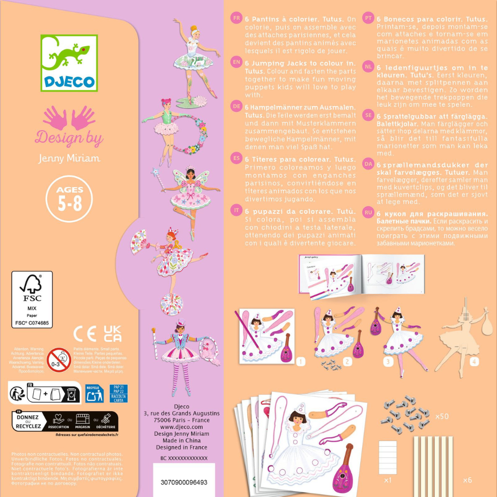 Das Djeco-Kunstset besteht darin, die Teile jeder Ballerina auszumalen und sie dann mit Klammern zu verbinden, so dass eine bewegliche Figur entsteht. Die fertigen Figuren laden zu Rollenspielen ein und lassen märchenhafte Geschichten entstehen, die die Fantasie beflügeln.