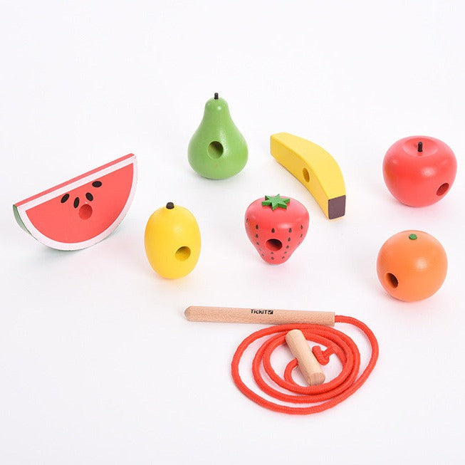 Jede Frucht hat Löcher zum Durchfädeln und zwei Schnüre mit hölzernen Einfädlern und Stoppern, so dass Ihr Kind einzigartige Aufhängungen kreieren kann.