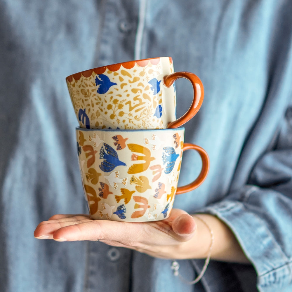 Das Set besteht aus zwei Bechern aus Steingut, die mit einem grafischen Motiv in warmen Tönen verziert sind.