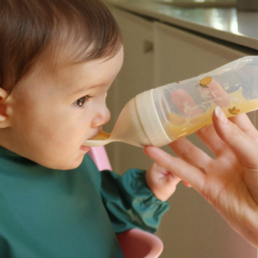 Das aus lebensmittelechten, BPA-freien Materialien hergestellte Set besteht aus einer Silikonflasche, die Sie einfach mit Nahrung füllen und leicht drücken, um die richtige Menge an Nahrung direkt auf den Löffel zu geben.