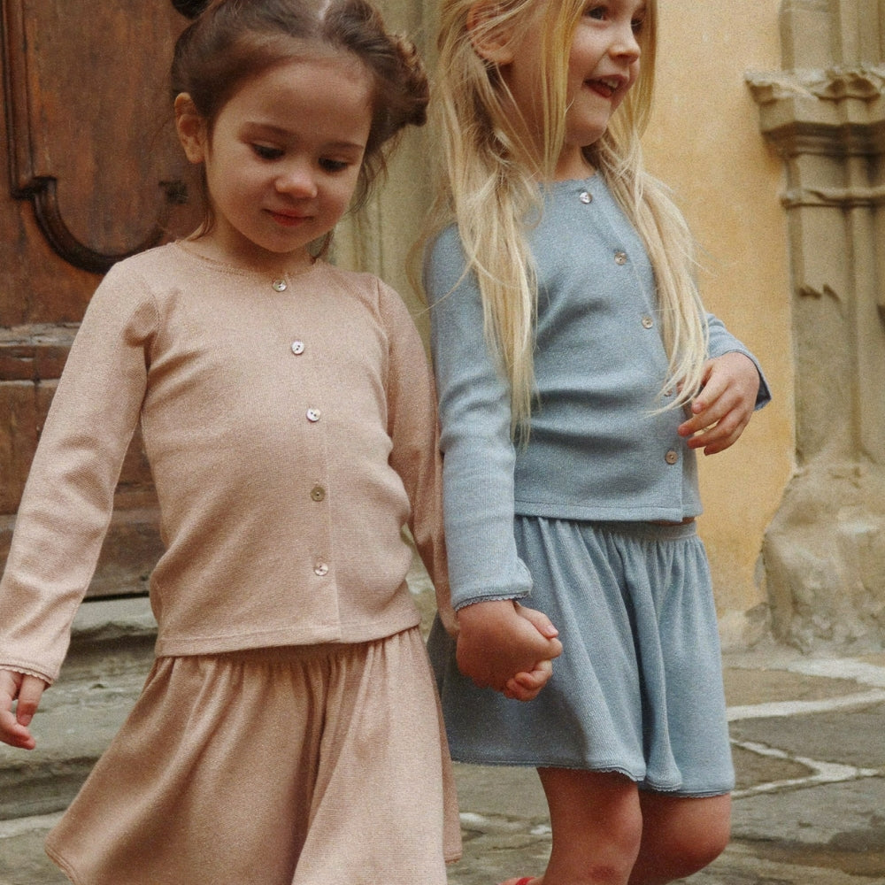 Das Modell Roli wurde mit Blick auf das alltägliche Styling entworfen - der weiche, dehnbare Stoff sorgt für Bewegungsfreiheit, während die dekorativen Kanten einen mädchenhaften Touch verleihen. Dank der eingearbeiteten Lurexpartikel schimmert der Mädchenrock sanft im Licht und verleiht ihm einen eleganten Look für den Alltag.