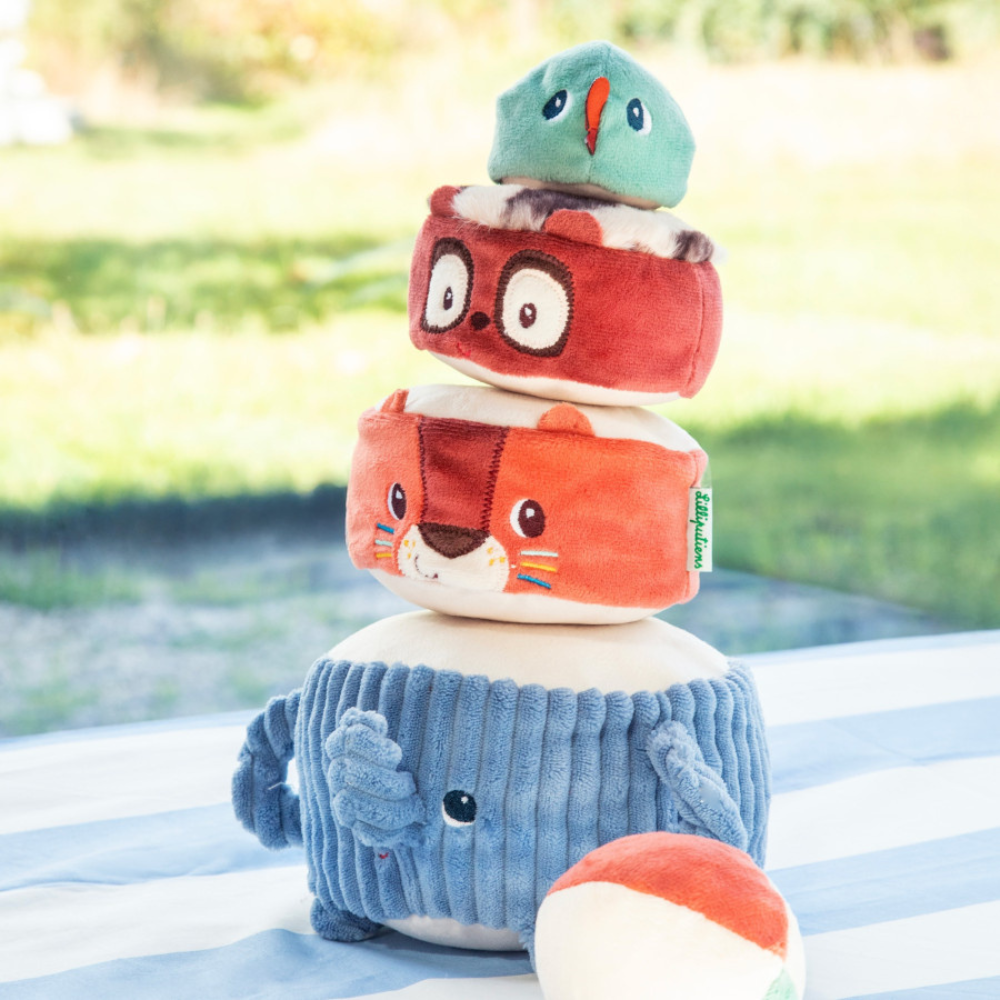 Die Klangpyramide mit Kuscheltieren von Lilliputiens ist ein Spielzeug, das Kleinkinder ab 12 Monaten in die Welt der Akrobaten entführt.