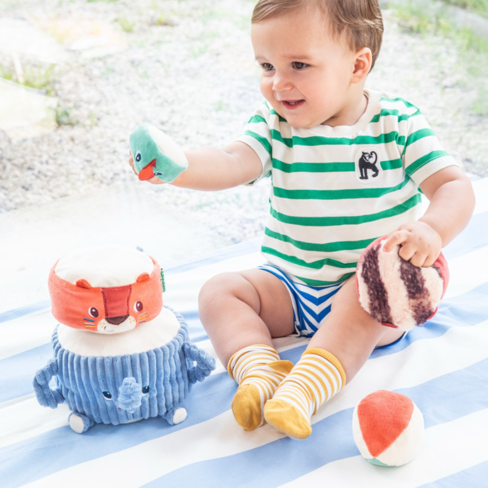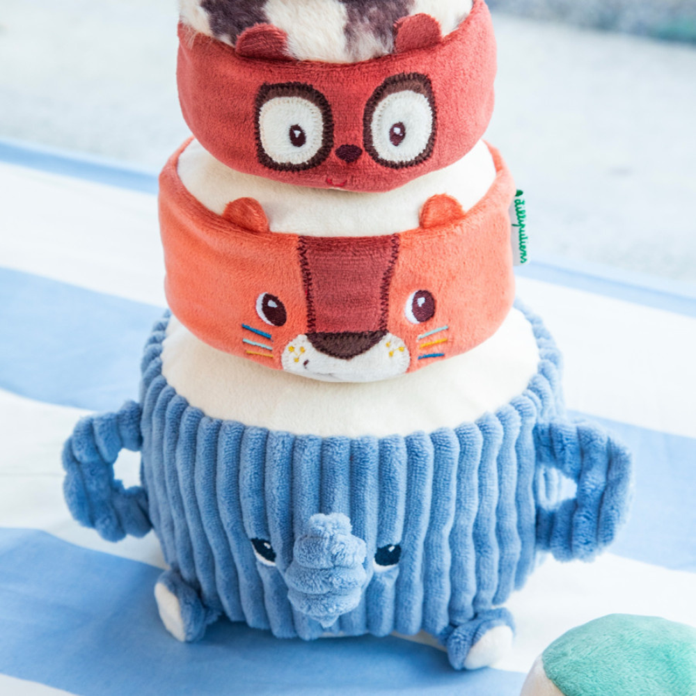 Elefant Albert trägt seine Freunde Jack den Löwen, Elvis den Lemur und den wachsamen Sittich - das Kleinkind stapelt sie übereinander, um einen Turm voller Klangüberraschungen zu schaffen.
