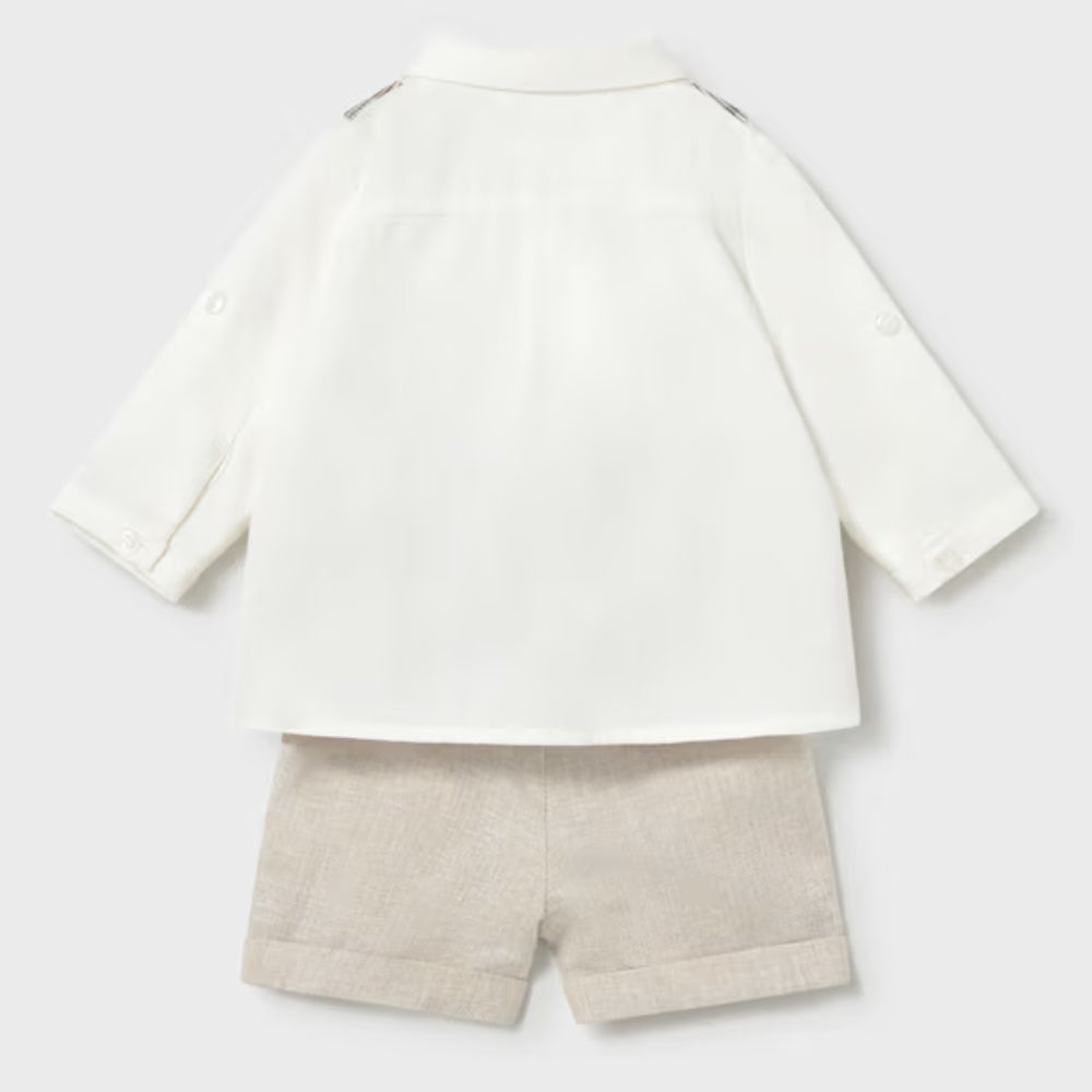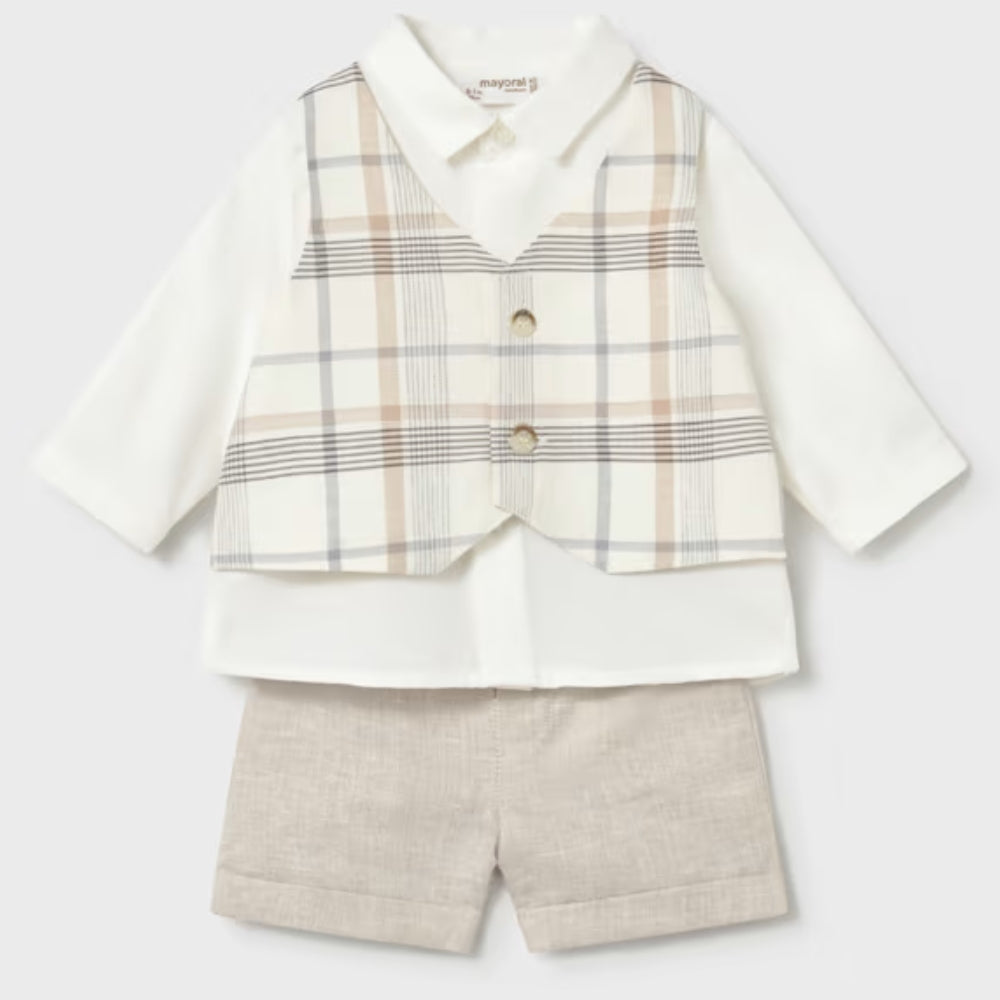 Das Set besteht aus einer beigen, kurzen Hose, einem weißen, langärmeligen Hemd und einer Weste mit zartem Karomuster. So entsteht ein kohärentes und sehr ästhetisches Ensemble, das schon in den ersten Lebenstagen getragen werden kann.