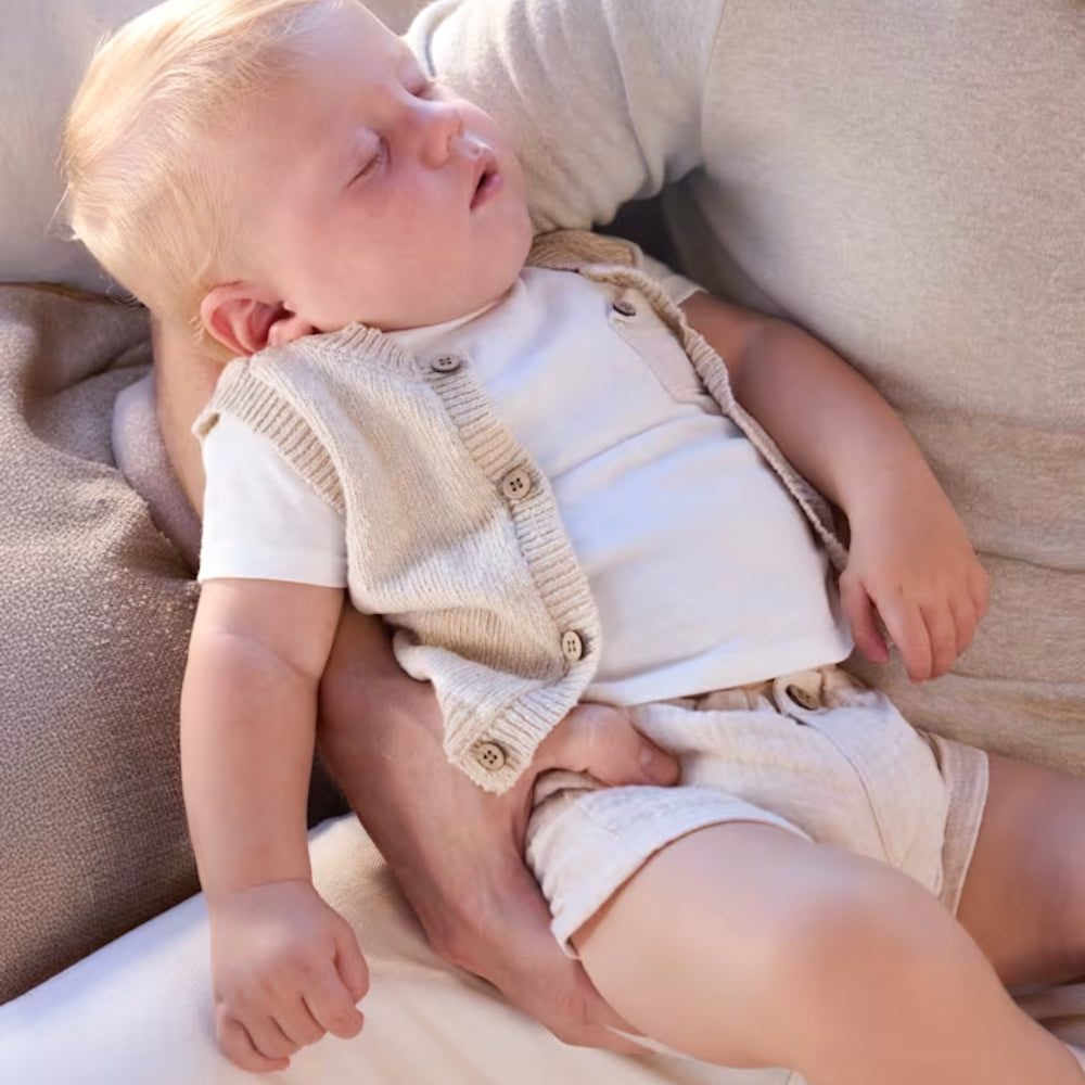 Das Set besteht aus einer beigefarbenen kurzen Hose, einem weißen kurzärmeligen Hemd und einer Weste, wodurch ein kohärentes und sehr ästhetisches Ensemble entsteht, das für die ersten Lebenstage geeignet ist.