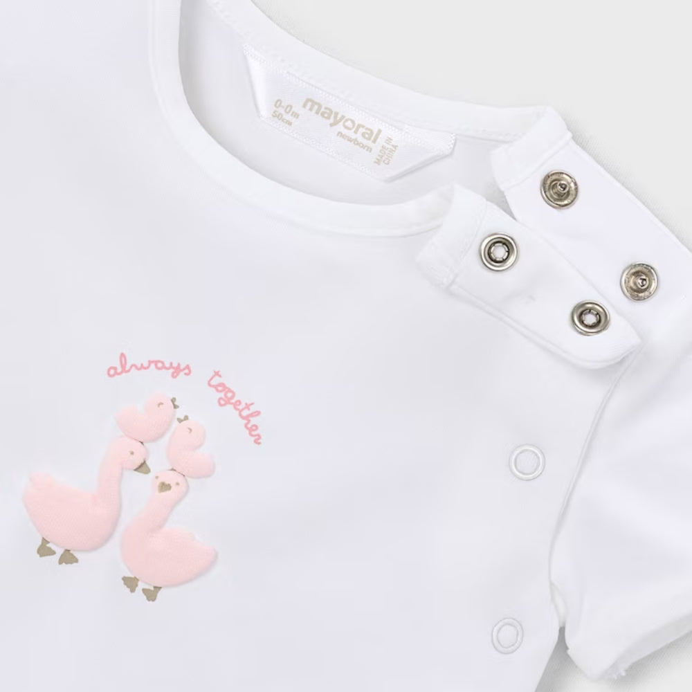 Das niedliche Gänsemotiv lässt das Neugeborenen-Set besonders weich und kindlich aussehen.