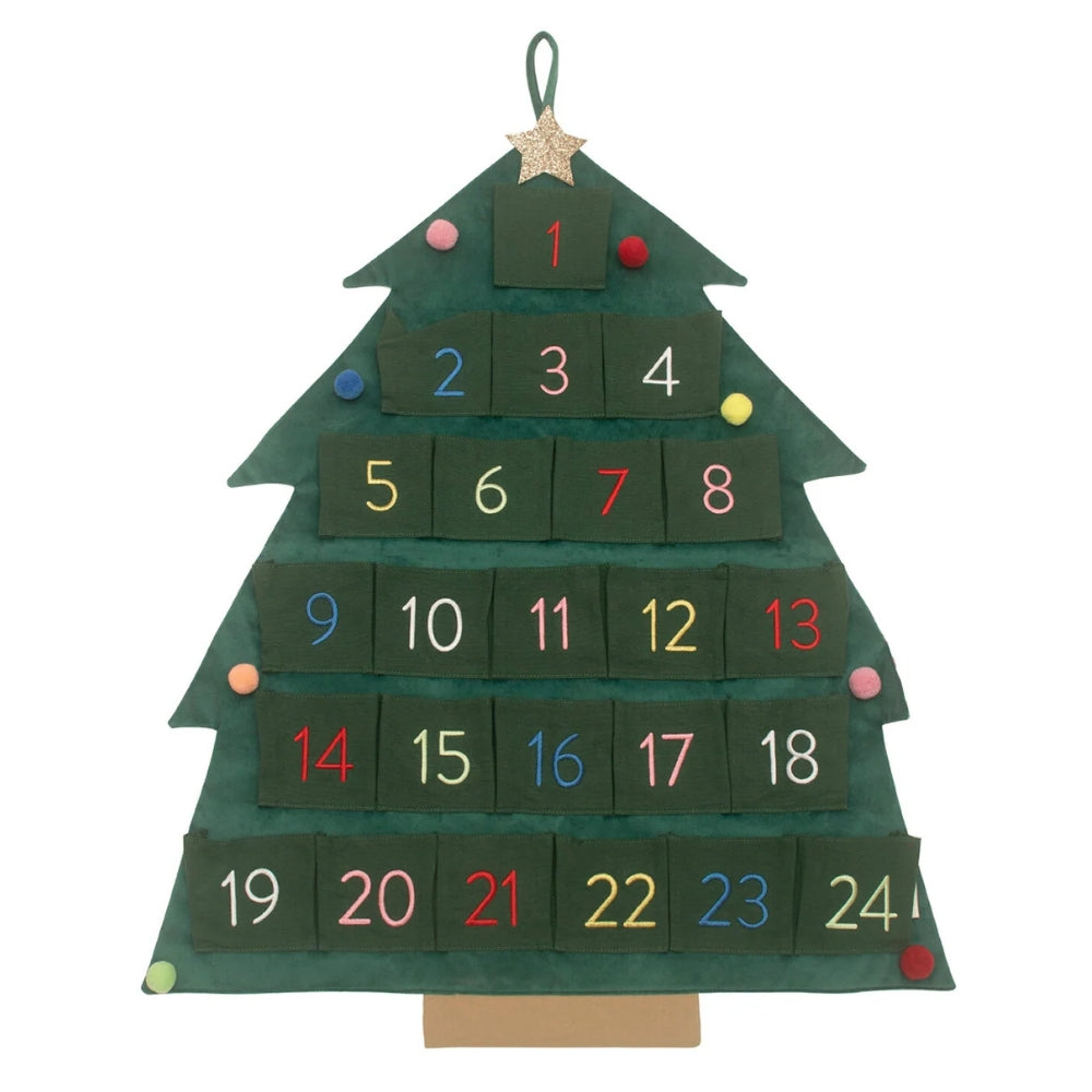Er ist aus weichem Samt in Form eines Weihnachtsbaums gefertigt, mit einem goldenen Stern und bunten Glitzerornamenten verziert und wird die Aufmerksamkeit von Kindern und Erwachsenen gleichermaßen auf sich ziehen.