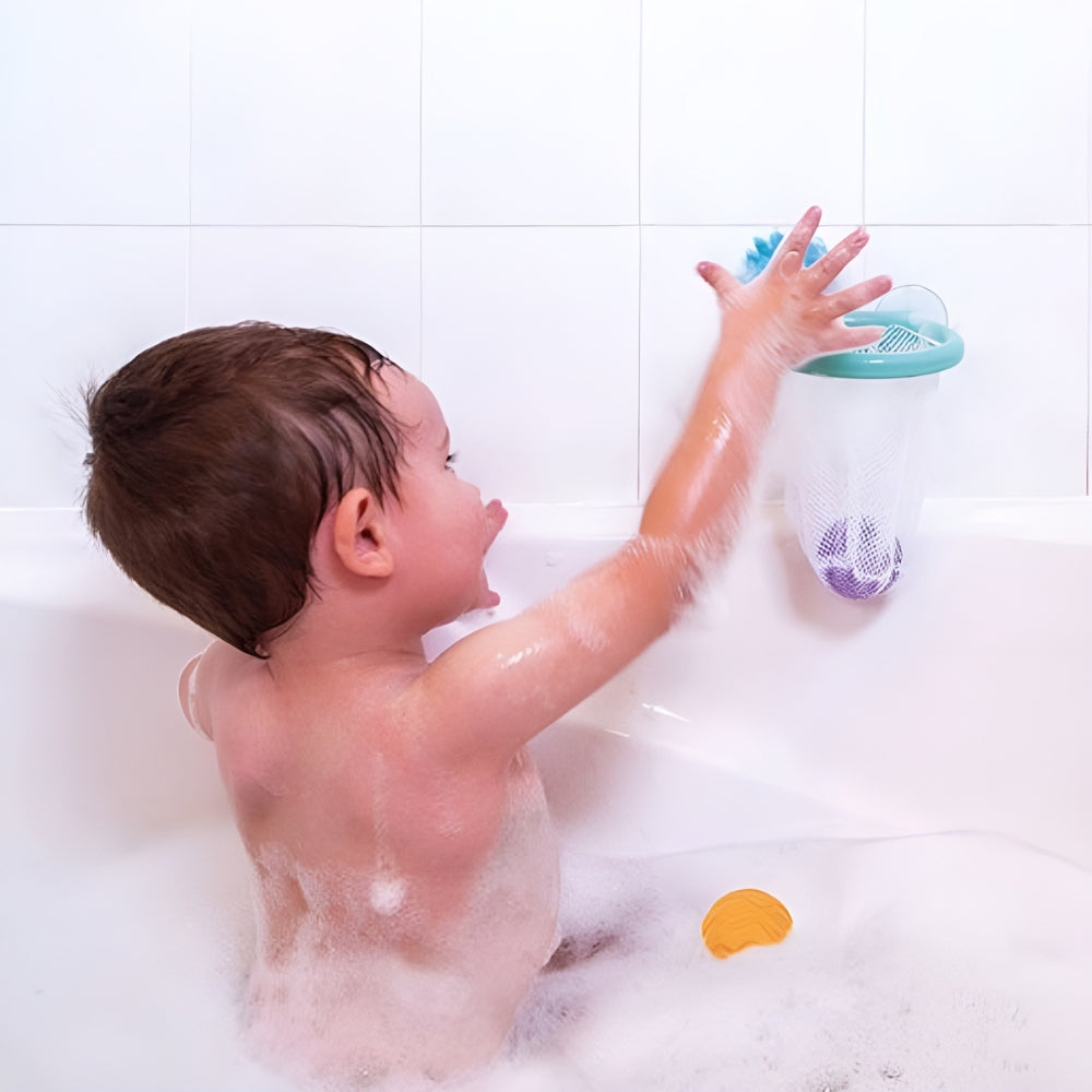 Das Set besteht aus einem weichen Korb mit Netz, der mit Saugnäpfen an der Badewanne oder glatten Badezimmerfliesen befestigt werden kann, und drei bunten Bällen. Die intensiven Farben - Orange, Türkis und Lila - und die unterschiedliche Beschaffenheit der Bälle regen den Tastsinn an und machen die Badezeit noch spannender.