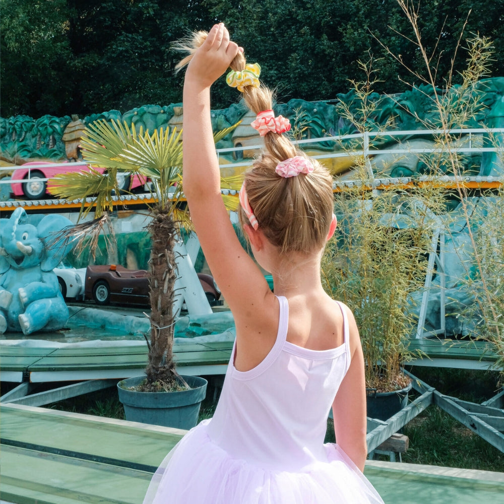 Jedes Haargummi hat ein kontrastreiches, unverwechselbares Finish, und am meisten Spaß macht es, wenn das Kind sie miteinander mischt: Sie können einzeln oder alle auf einmal getragen werden und ergeben eine auffällige, bunte Komposition.