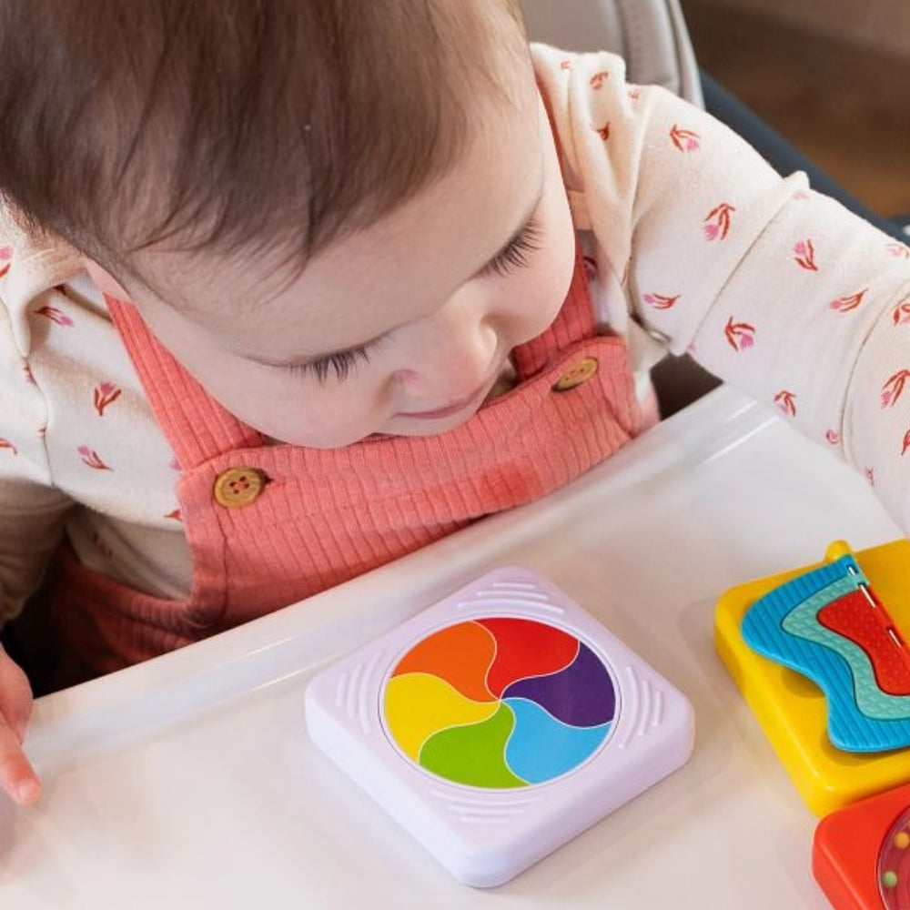 Das Sensory Square von Fat Brain Toys ist ein fesselndes Aktivitätsspielzeug, das mit seinem beweglichen, farbenfrohen Ziffernblatt Babys Blicke auf sich zieht und sie zum Erforschen mit ihren Händen anregt.