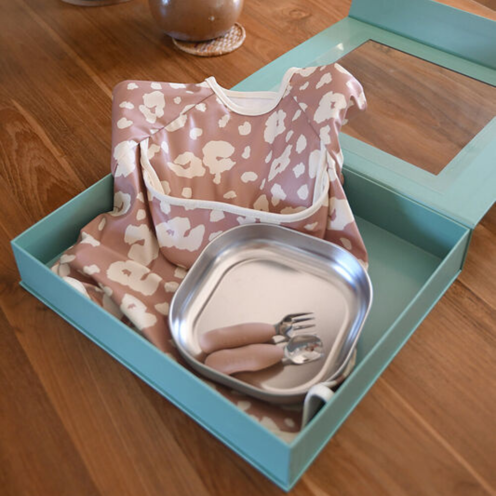 Das elegante Komplettset ab 4 Monaten enthält einen Teller, ein Trainingsbesteck und ein Lätzchen mit Ärmeln, verpackt in einer robusten Aufbewahrungsbox.