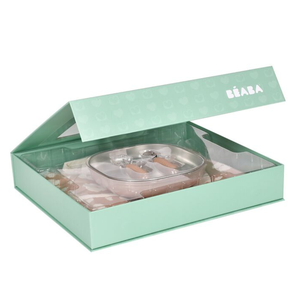 Das wunderschön verpackte Geschenkset kann sofort nach dem Kauf verschenkt werden, und das durchdachte Design von Beaba erleichtert die täglichen Mahlzeiten und die gemeinsamen Momente am Tisch.