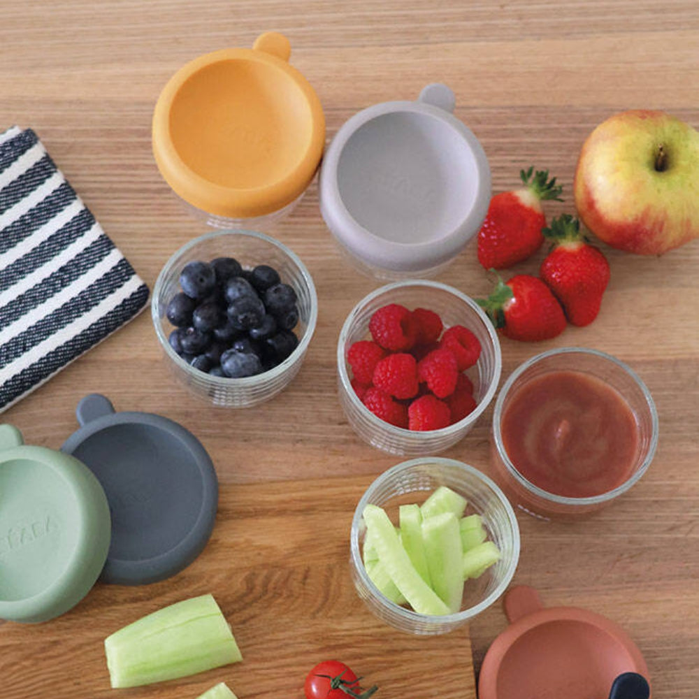 Die Glasbehälter von Beaba eignen sich zum Einfrieren und Aufwärmen von Speisen, auch in der Mikrowelle, und ihre luftdichten Silikondeckel schützen die Lebensmittel vor Geschmacks- und Aromaverlusten.