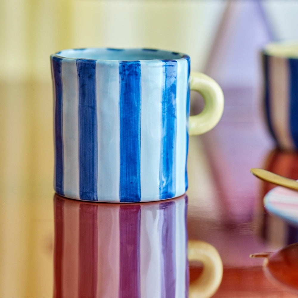 Die handgemalten Streifen in verschiedenen Farbtönen lassen jede Tasse etwas anders aussehen, während die glänzende Oberfläche und die bunten Griffe einen leichten und modernen Touch verleihen.