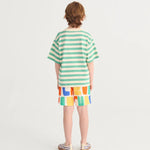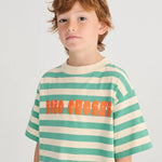 Das Bobo Choses Kinder-T-Shirt ist ein auffälliges Modell, das mit seinem farbenfrohen, künstlerischen Druck und Streifenmuster sofort ins Auge fällt.