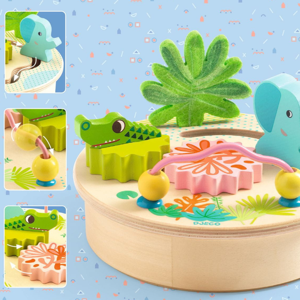 Auf dem runden Tisch befinden sich verschiebbare Perlen, ein Elefant, der sich hinter Büschen versteckt, und Krokodilzahnräder.