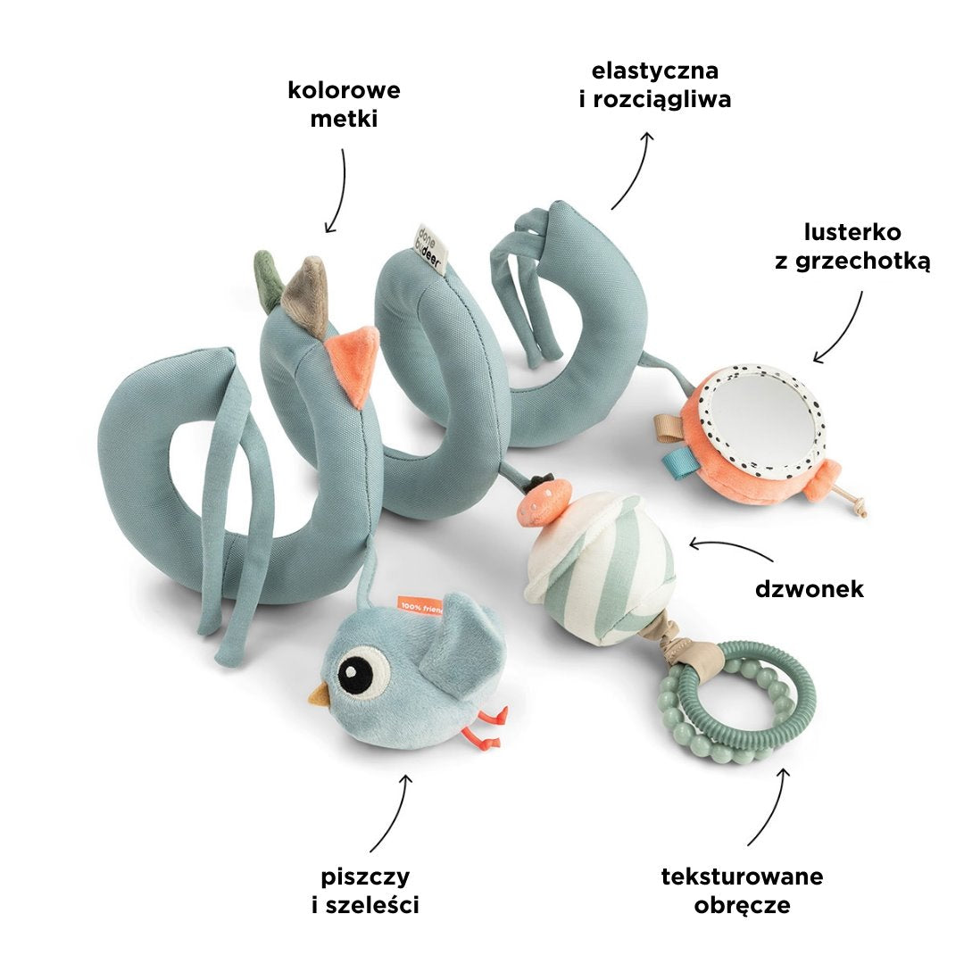 Der Done by Deer Stroller Pendant in Form einer Spirale ist der perfekte Begleiter für die sensorische Erkundung Ihres Kindes außerhalb des Hauses.