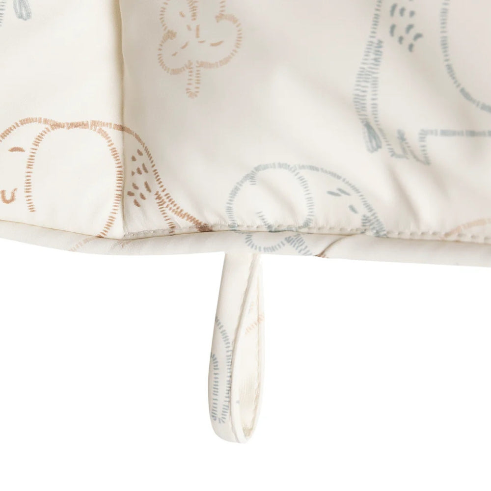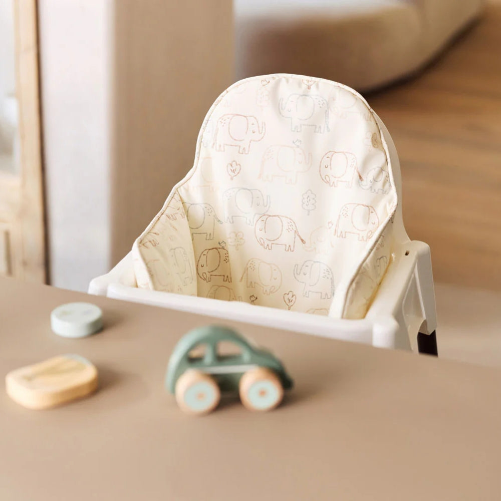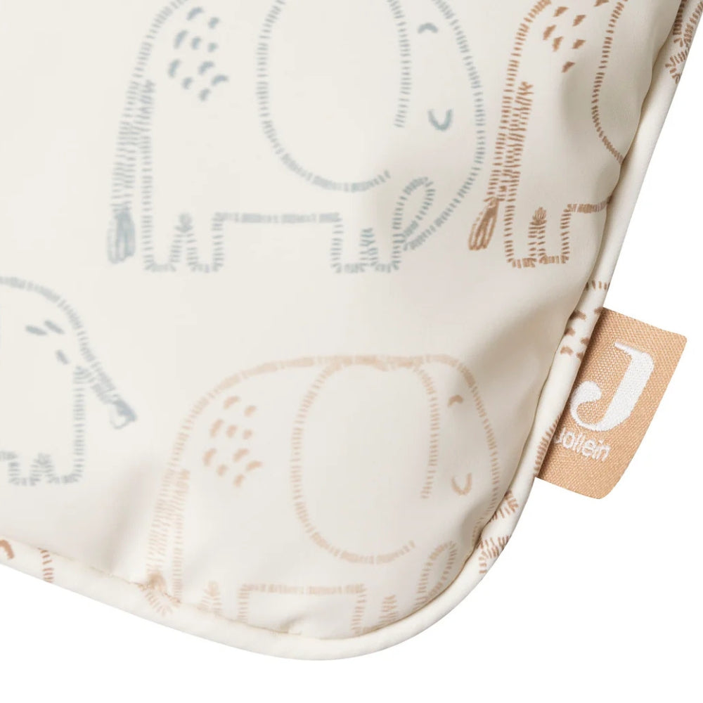Das Feeding Chair Cushion von Jollein mit dem niedlichen Elephant Tales-Print macht den Sitz während der Mahlzeiten noch bequemer.