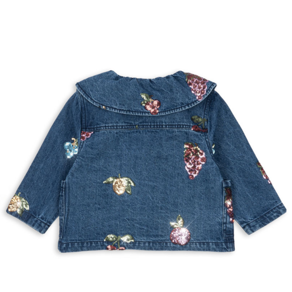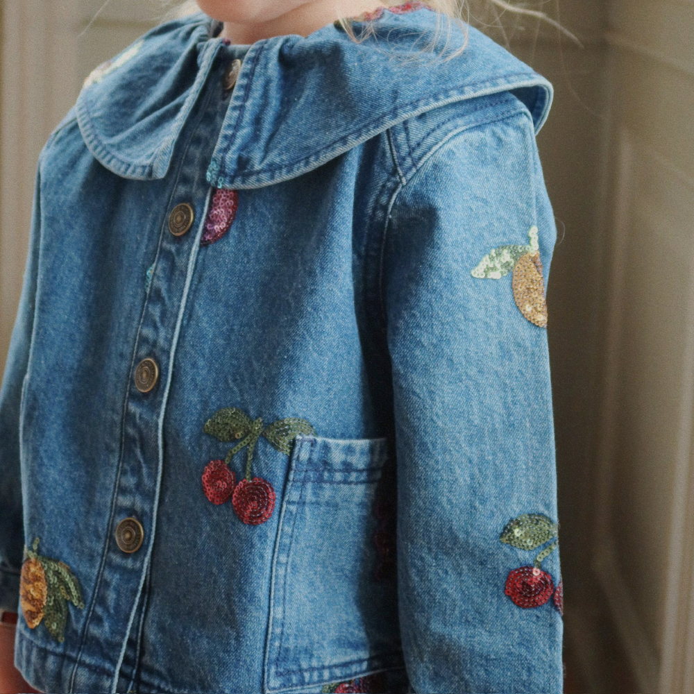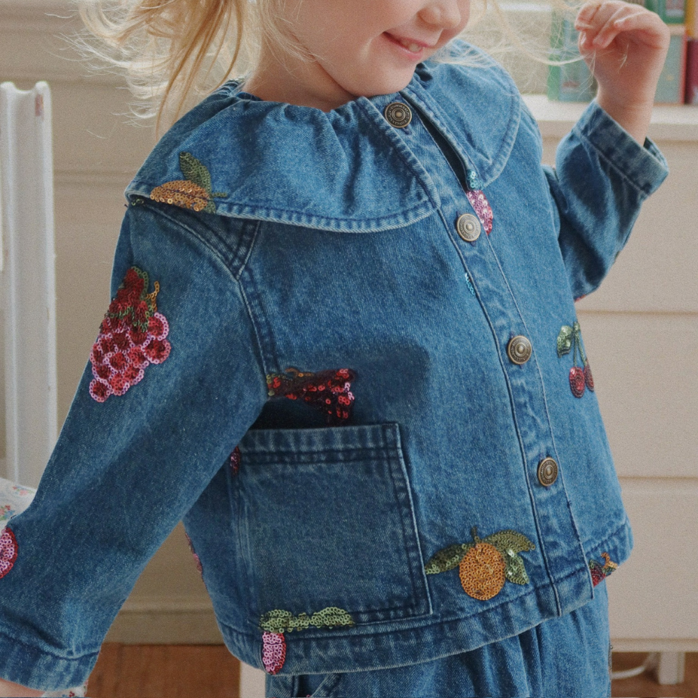 Die Jeansjacke für Mädchen von Konges Slojd ist eine weiche Shirt-Catana mit rundem Kragen und bestickten Paillettenfrüchten - perfekt für den Alltag und besondere Anlässe.