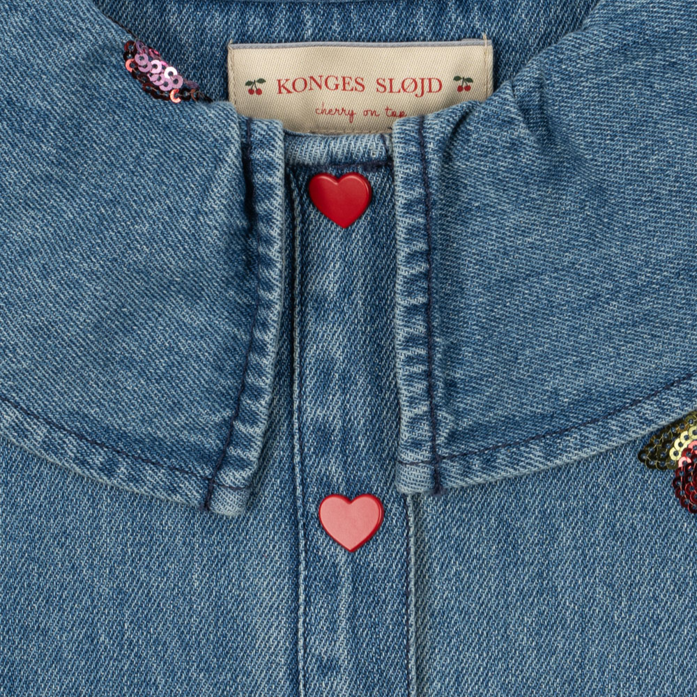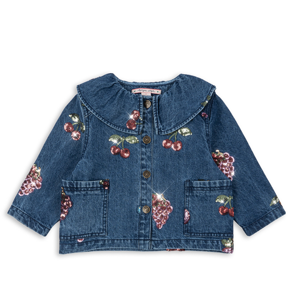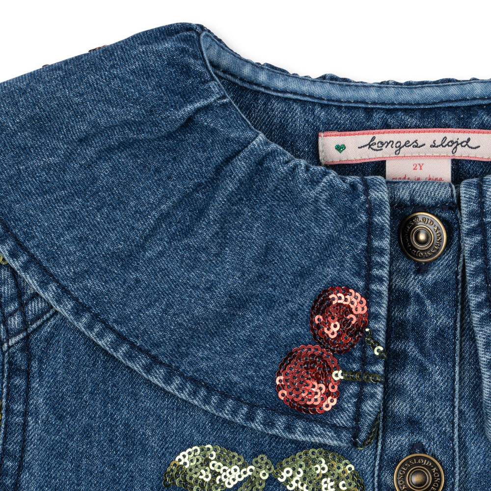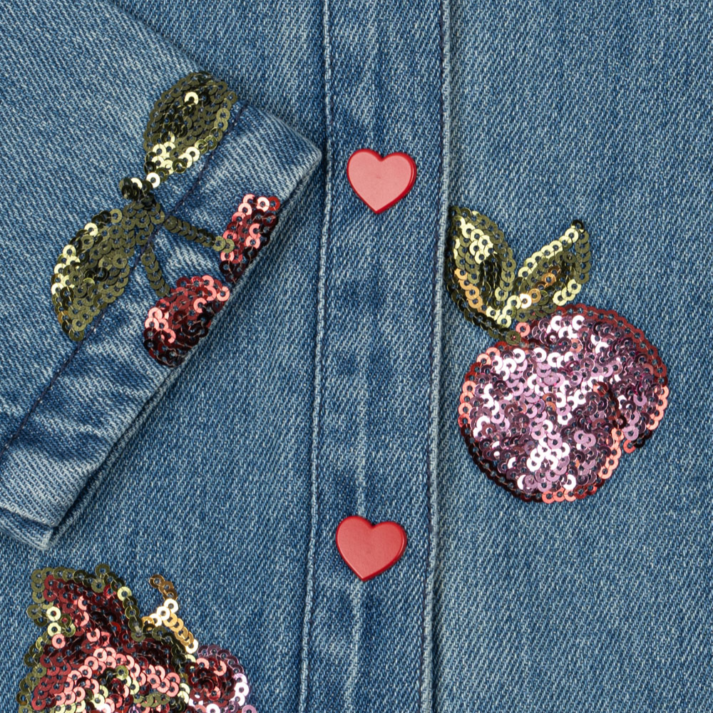 Die Jeansjacke für Mädchen von Konges Slojd ist eine weiche Shirt-Catana mit rundem Kragen und bestickten Paillettenfrüchten - perfekt für den Alltag und besondere Anlässe.