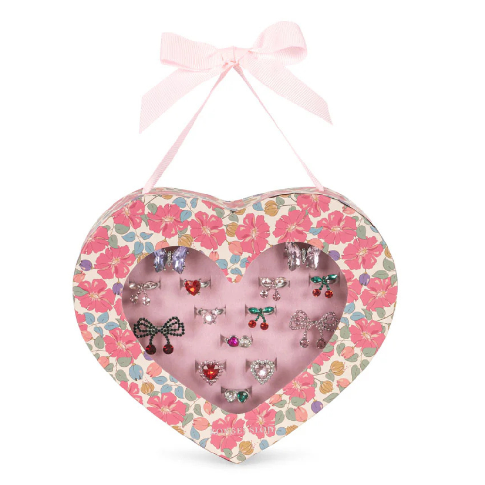 Die herzförmige Box enthält 14 verschiedene Teile - funkelnde Glasaugen, subtile Motive und zeitlose Details, die typisch für Konges Slojd sind. Die verstellbaren Ringe passen sich bequem den Fingern an, und die elegante Verpackung macht das Schmuckset zu einem perfekten Geschenk.