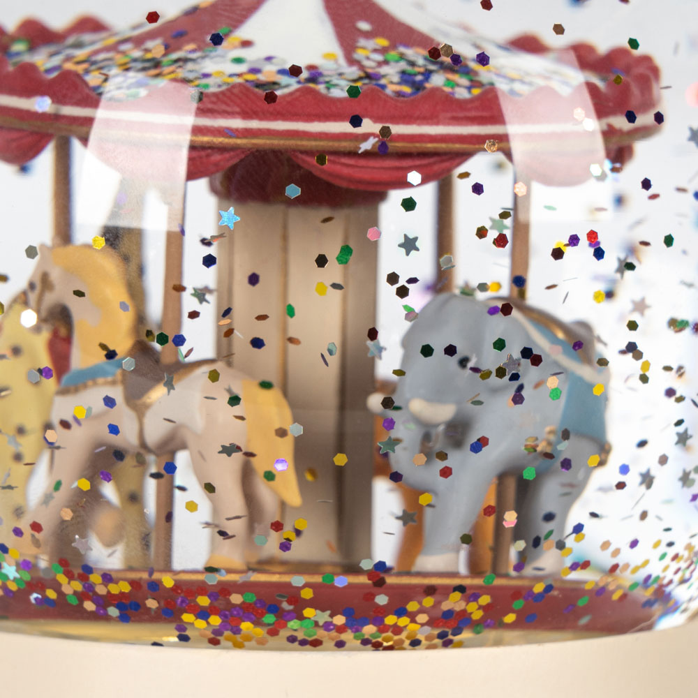 Die Glaskarussellkugel von Konges Slojd ist eine wunderschöne, detailreiche Dekoration, die das Zimmer Ihres Kindes erhellt und eine beruhigende Atmosphäre vor dem Schlafengehen schafft. Ein sanftes Schütteln löst einen Glitzertanz aus, und dank der praktischen Lichtfunktion kann sie auch als stimmungsvolle Nachttischlampe verwendet werden.