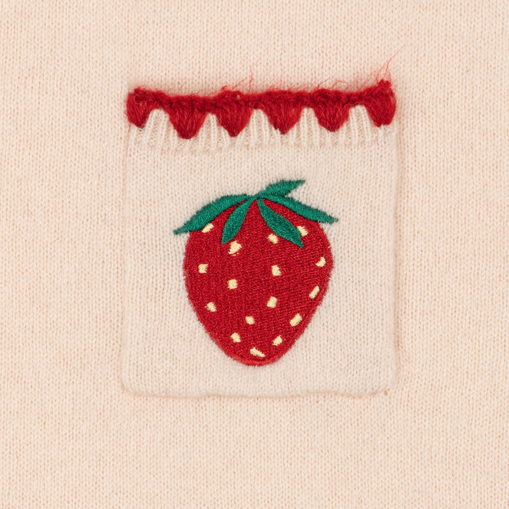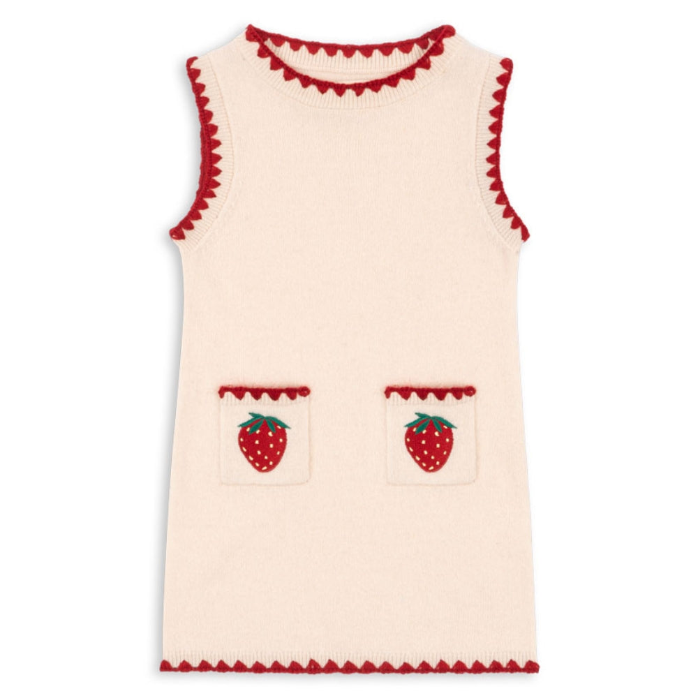 Die dezente Stickerei in Form von Erdbeeren verleiht ihm Charme und eine einzigartige Note, während die gerade, leicht taillierte Silhouette und die praktischen Vordertaschen für Funktionalität sorgen. Das Konges Slojd Kleid für Mädchen wurde für den Alltag entworfen - es ist warm, bequem und dennoch voller mädchenhaftem Charme.