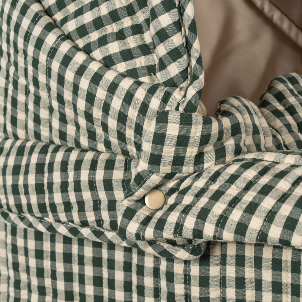 Das von Konges Slojd entworfene Design kombiniert einen klassischen Look mit praktischen Details: gesteppter Stoff, eine Baumwollmatratze und ein weich gepolsterter Korb für Kleinigkeiten unter der Tragewanne laden zu langen Spaziergängen rund ums Haus und darüber hinaus ein.
