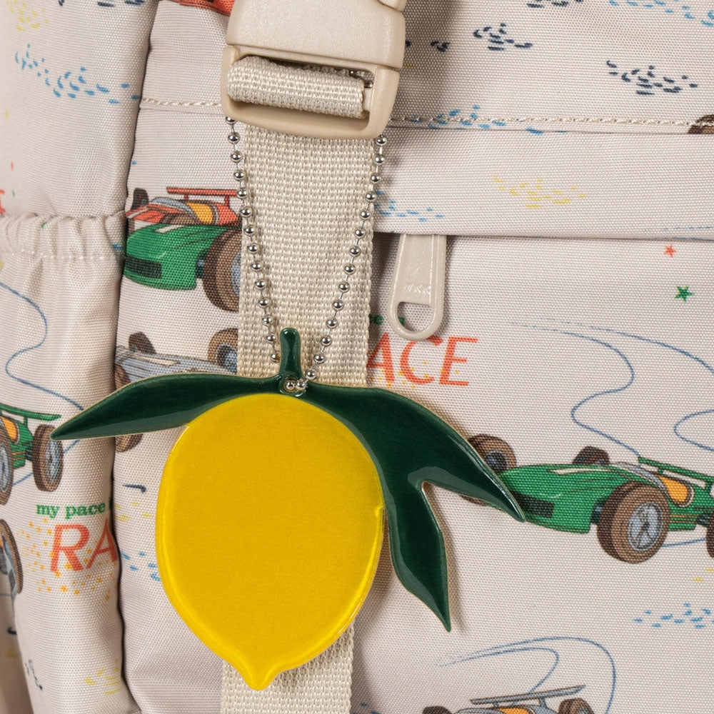 Ein kleiner Sichtbarkeitsanhänger erhöht die Sicherheit auf dem Weg zur Schule. Der Schulrucksack verfügt über ein geräumiges Bücherfach, ein gepolstertes Brotzeitfach und ein externes Flaschenfach.