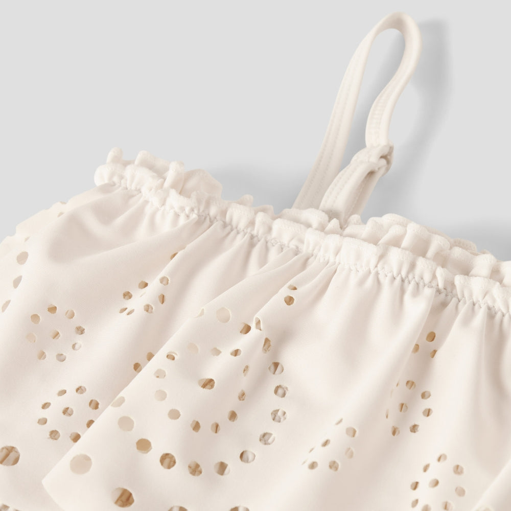 Dieser Badeanzug von Lil' Atelier ist ein Design, das Stil, Komfort und Umweltfreundlichkeit vereint. Der Einteiler in einem sanften Cremeton ist für Mädchen gedacht, die gerne im Wasser spielen und Sommertage voller Sonnenschein lieben.