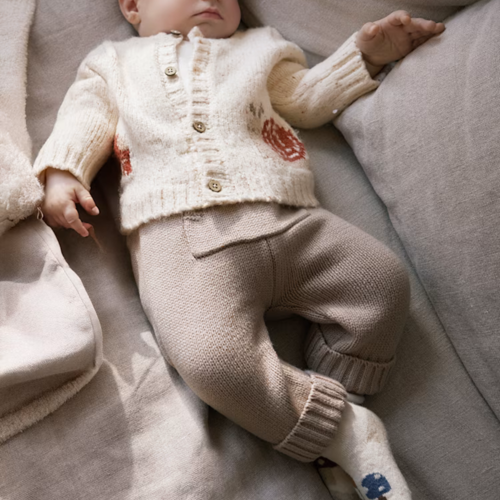 Das Set besteht aus einer Strickjacke mit Knöpfen auf der Vorderseite und bezaubernden Jacquard-Motiven, einem T-Shirt mit Rundhalsausschnitt und praktischem Druckknopf im Nacken für einfaches Umziehen und einer Shorts mit elastischem Bund und einer funktionellen Tasche auf der Vorderseite.