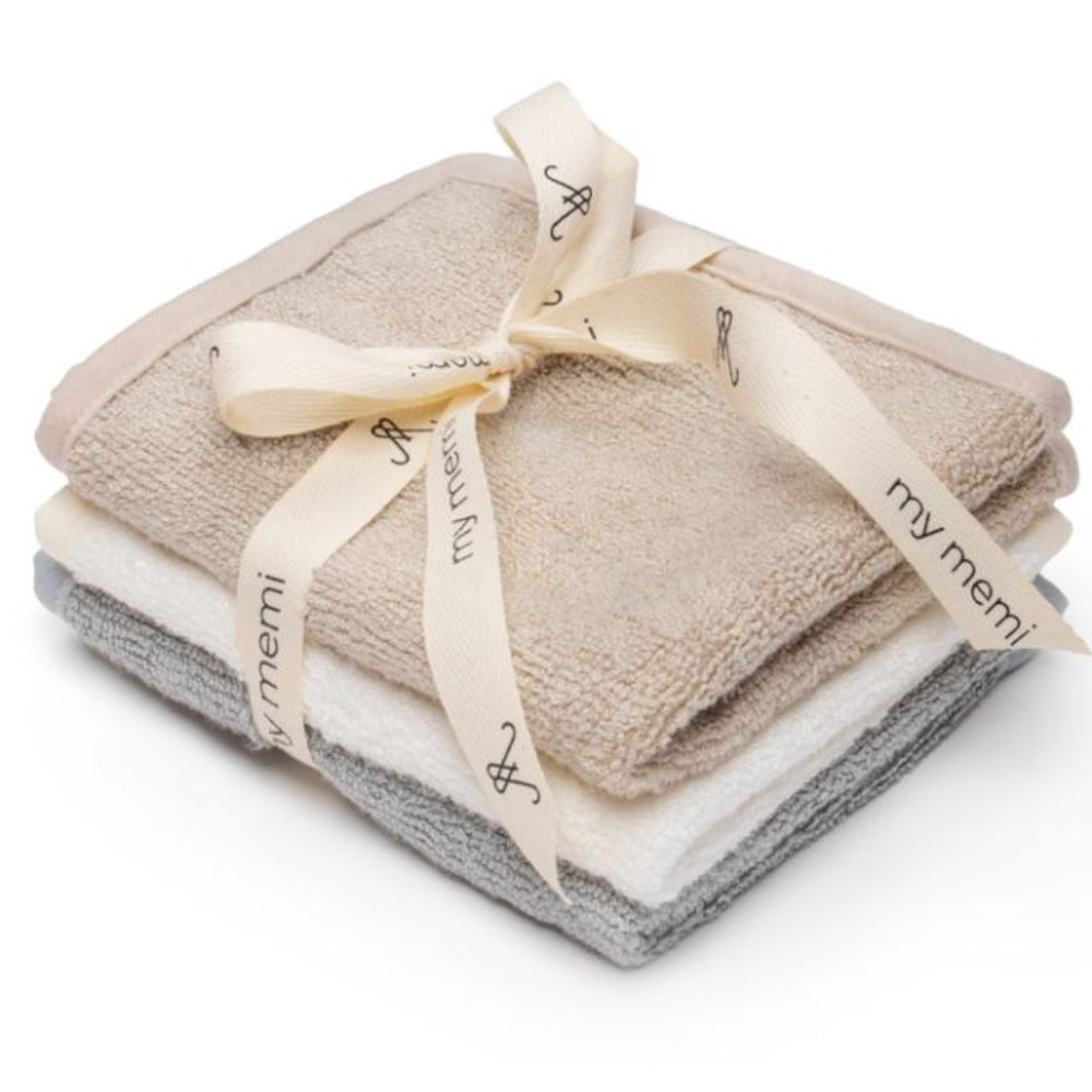 Das Bambus-Handtuch-Set mit drei funktionellen cremefarbenen/hellgrauen/beigen Mini-Handtüchern der Marke Memi ist ein Produkt, das alle Eltern nützlich finden werden.