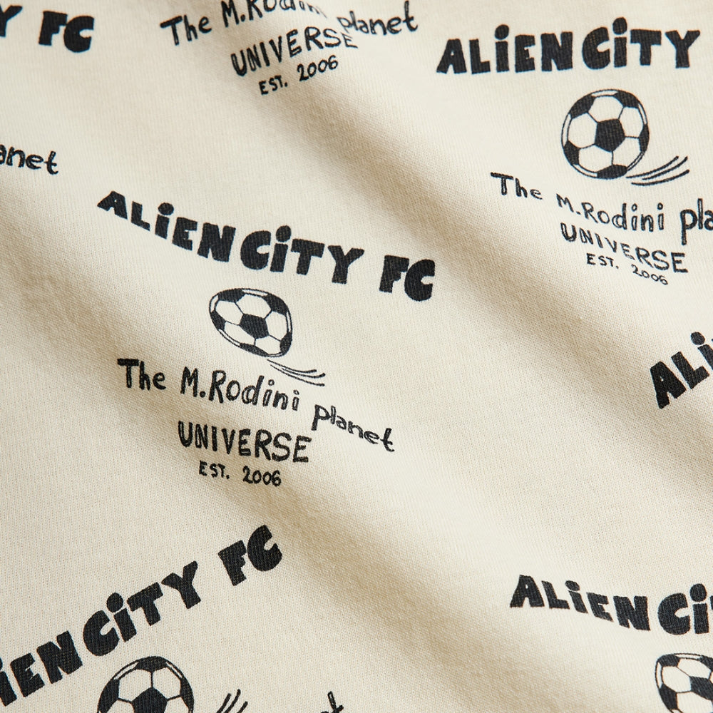 Auf dem hellen cremefarbenen Grundgewebe ist ein schwarzer Aufdruck mit Bällen und Alien City FC-Schriftzug angebracht, der dem Ganzen einen sportlich-verspielten Touch verleiht.