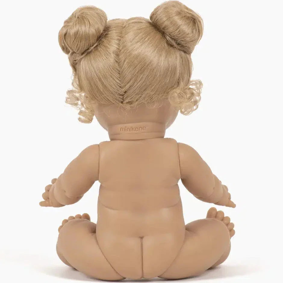 Die Louise Babypuppe hat blau-graue Augen und blonde Haare, die zu einem Dutt frisiert sind, sowie Strähnchen, die nach Vanille duften.