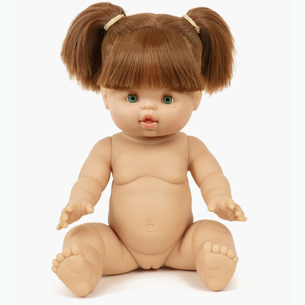 Mit ihren grünen Augen, den Sommersprossen im Gesicht und den geflochtenen roten Zöpfen sieht diese Puppe aus wie ein echter Begleiter für Kindergeschichten.
