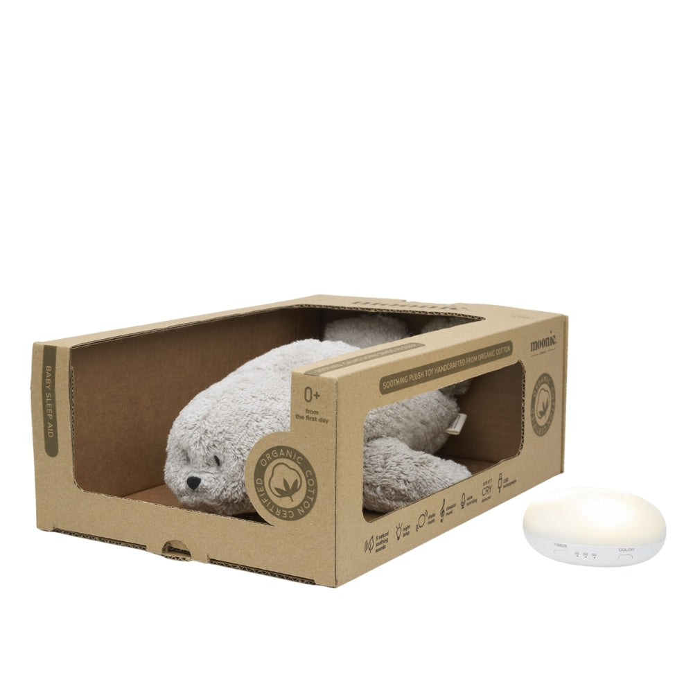 Die kuschelige Brummdichtung von Moonie ist eine moderne Einschlafhilfe, die Funktionalität mit sicheren Materialien und einem niedlichen Design verbindet.