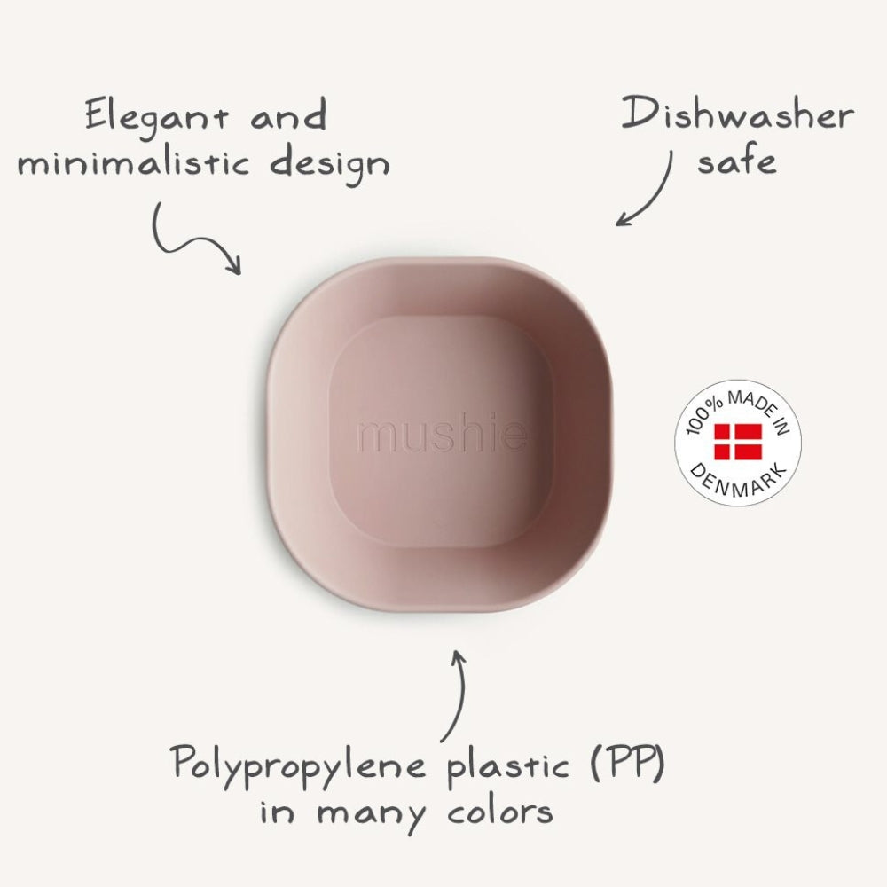 Die beiden quadratischen Babyschalen von Mushie sind für die ersten selbstständigen Mahlzeiten Ihres Kindes gedacht.