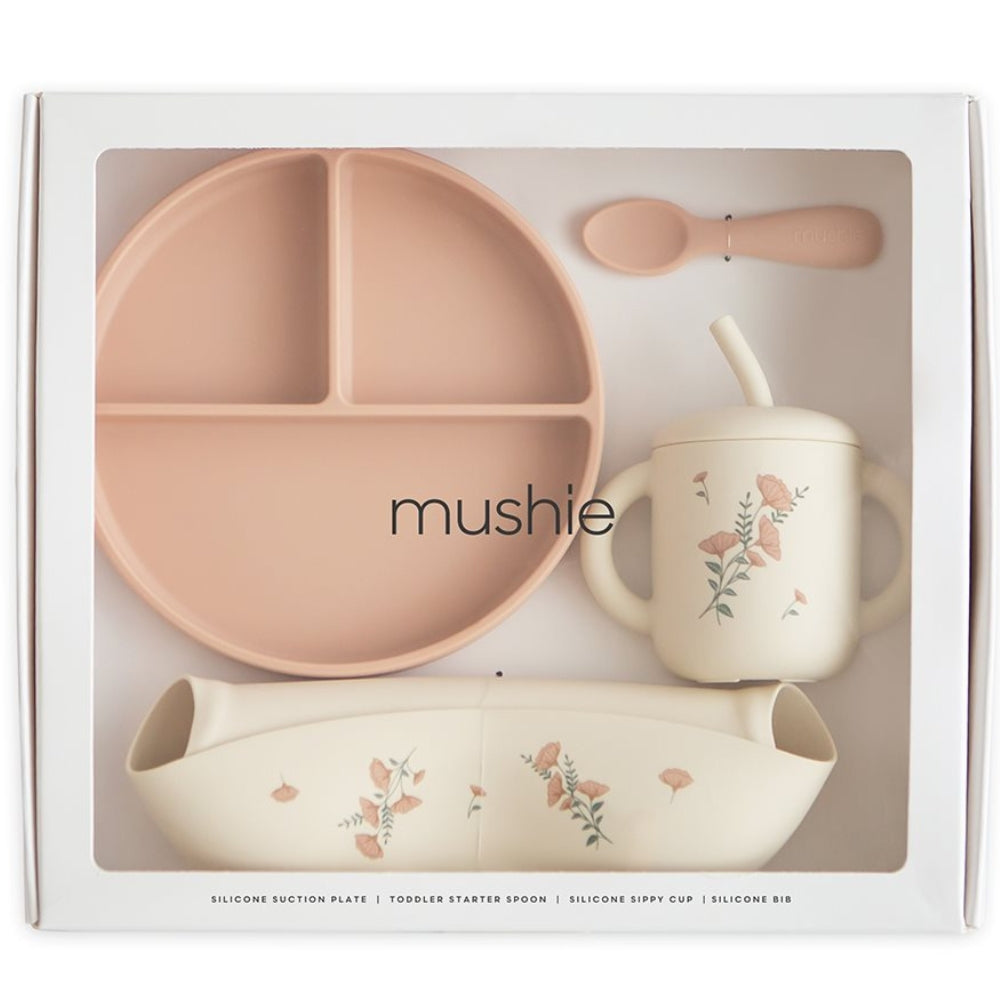Mushie Silikon-Geschirrset - Rosa Blumen