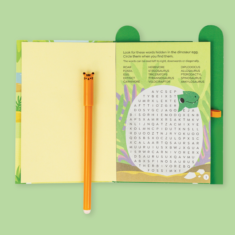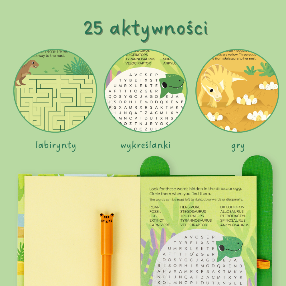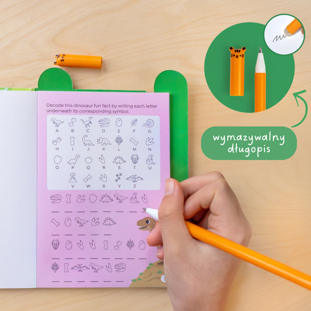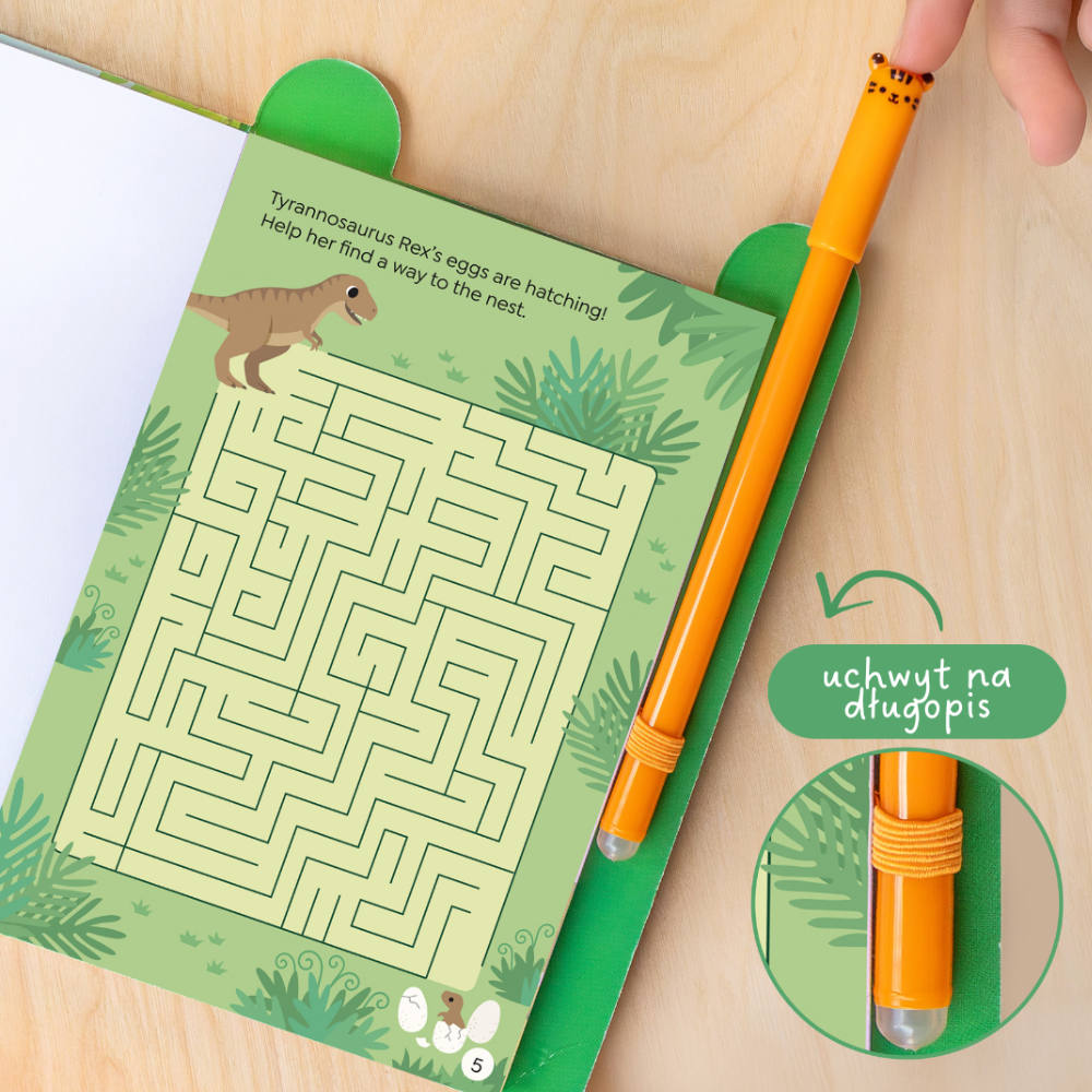 Im Inneren erwarten Sie Labyrinthe, Rätsel, Wortspiele und Logikrätsel - alles an einem Ort, zum Thema der beliebten Dinosaurier.