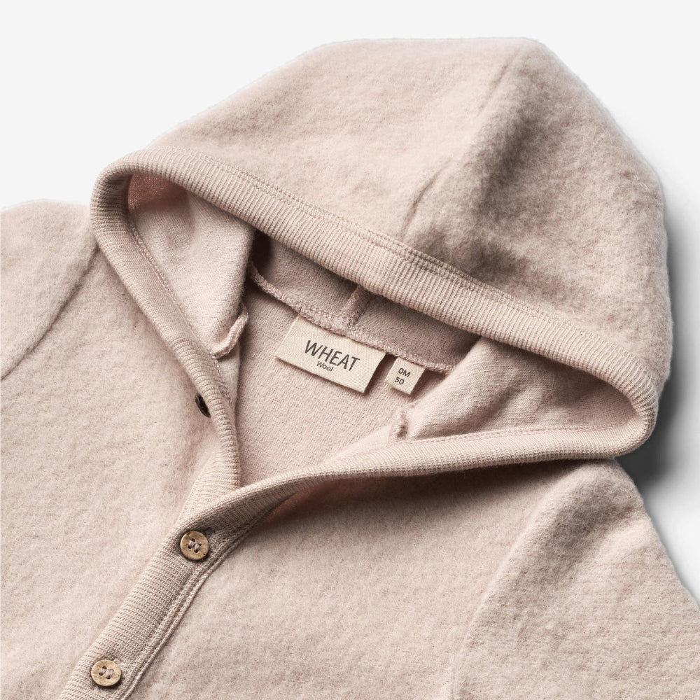 Der Baby-Overall aus Merinowolle von Wheat ist die perfekte Wahl für kältere Tage. Die weiche Mischung aus gefilzter Merinowolle und Bio-Baumwolle fühlt sich angenehm an und hält das Baby warm und bequem.